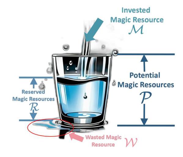 示意图:采用倒水入杯模型类比展示注入魔术资源(M)、潜在魔术资源(P)与存留魔术资源(R)之间的关系。
