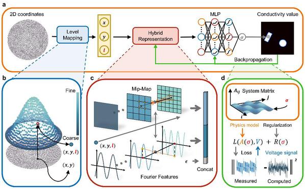 针对这一挑战,研究团队深入剖析电阻抗成像的物理机理,提出了物理驱动神经补偿的自监督学习框架,并创新构建了灵敏度感知机制——通过基于物理先验的层级映射,使神经网络能够感知物理场中灵敏度的空间分布。该机制类似人眼的“注视”功能——在低灵敏度区域自动投入更多的表征能力进行补偿,而在高灵敏度区域施加适当约束,以有效抑制噪声。同时,研究团队提出了融合多尺度嵌入与傅里叶特征投影的混合表征方法,并配合自主设计的频率正则化策略,显著提升了神经网络在高、低灵敏度区域的重建能力与鲁棒性。