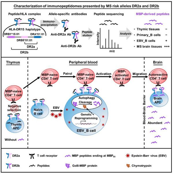 2026年1月14日,中国科学技术大学生命科学与医学部、免疫应答与免疫治疗全国重点实验室王剑教授课题组与苏黎世大学RolandMartin教授课题组合作在《Cell》期刊在线发表题为“EBVInfectionandHLA-DR15JointlyDriveMultipleSclerosisbyMyelinPeptidePresentation”的研究论文。该研究通过免疫多肽谱分析和自身反应性CD4+T细胞功能鉴定,揭示了爱泼斯坦-巴尔病毒(EBV)感染与人类白细胞抗原HLA-DR15协同作用,通过呈递髓鞘自身抗原多肽并激活自身反应性CD4+T细胞,共同驱动多发性硬化症(MS)发生的新机制。