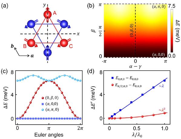 图1 Mn3Sn的磁构型和磁各向异性能。(a)磁构型。(b)根据自旋群表示理论得到的SO(3)空间中的磁各向异性能大小。(c)在特定Euler角下的各向异性能。(d)各向异性能的差值与自旋轨道耦合强度的标度关系。