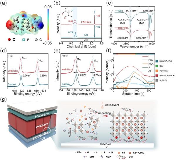 图1.Dex与钙钛矿的相互作用及其界面富集行为