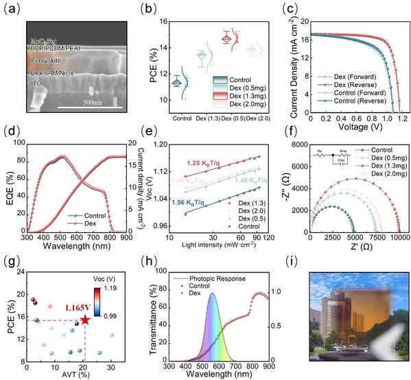 图2.半透明钙钛矿太阳能电池的器件性能与透光特性